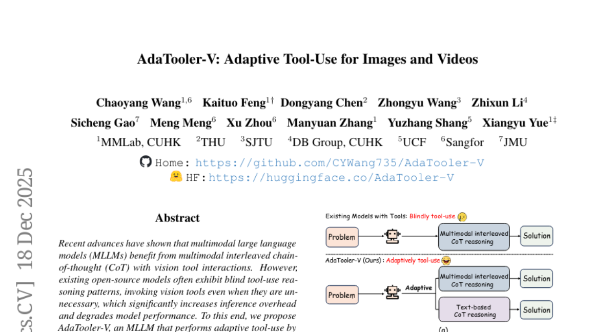 – AdaTooler-V aims to enhance multimodal language models’ performance by adaptively using vision tools only when beneficial, thus reducing unnecessary operations and improving efficiency in visual reasoning tasks.