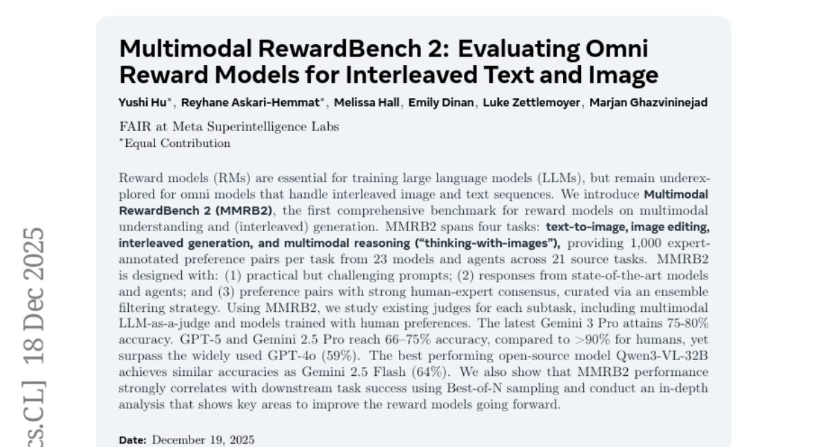 – Introduce Multimodal RewardBench 2 (MMRB2) as a benchmark for reward models focusing on multimodal understanding and interleaved text-image generation tasks.