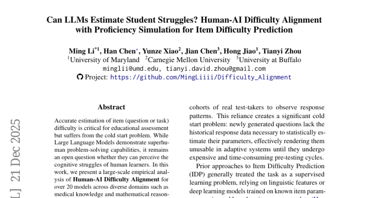 – Conducted large-scale empirical analysis on Human-AI Difficulty Alignment using over 20 models across domains such as medical knowledge and mathematical reasoning.