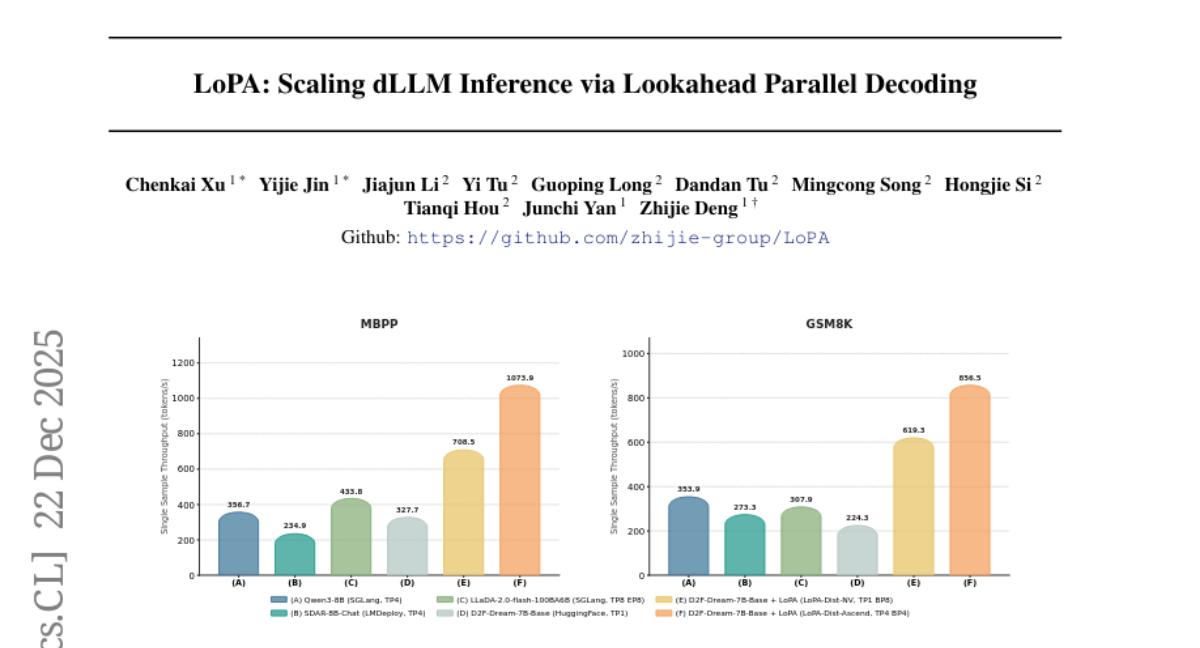 – The application of LoPA significantly increases the tokens per forward pass in state-of-the-art D2F models, achieving superior throughput and maintaining high performance compared to the baseline. The system achieves a throughput of 1073.9 tokens per second using multi-GPU deployment.