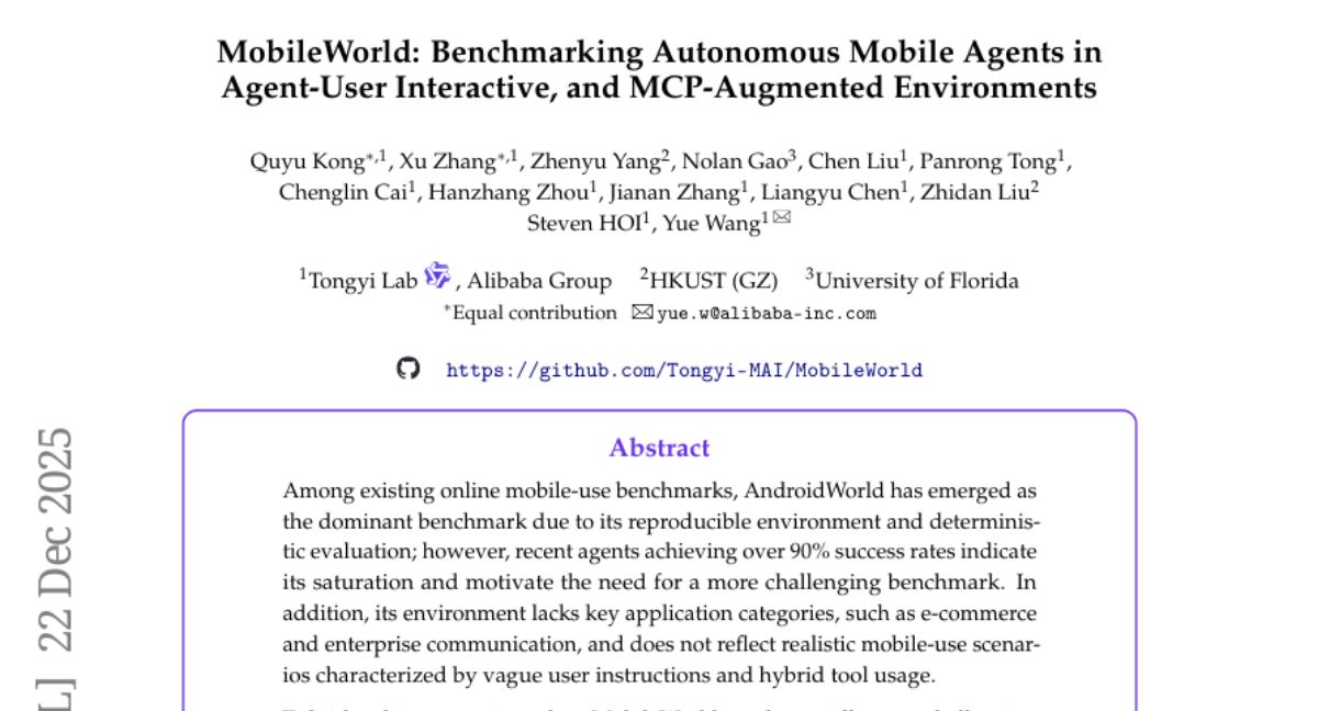 ๐Ÿ”‘ Keywords: MobileWorld, long-horizon tasks, cross-application interactions, agent-user interaction, MCP-augmented tasks