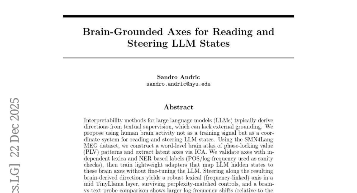 – Neurophysiology-grounded axes are shown to provide interpretable and controllable handles for altering LLM behavior, with robust axes demonstrated in models like TinyLlama and GPT-2. The study supports a new interface for LLMs grounded in neurophysiology.