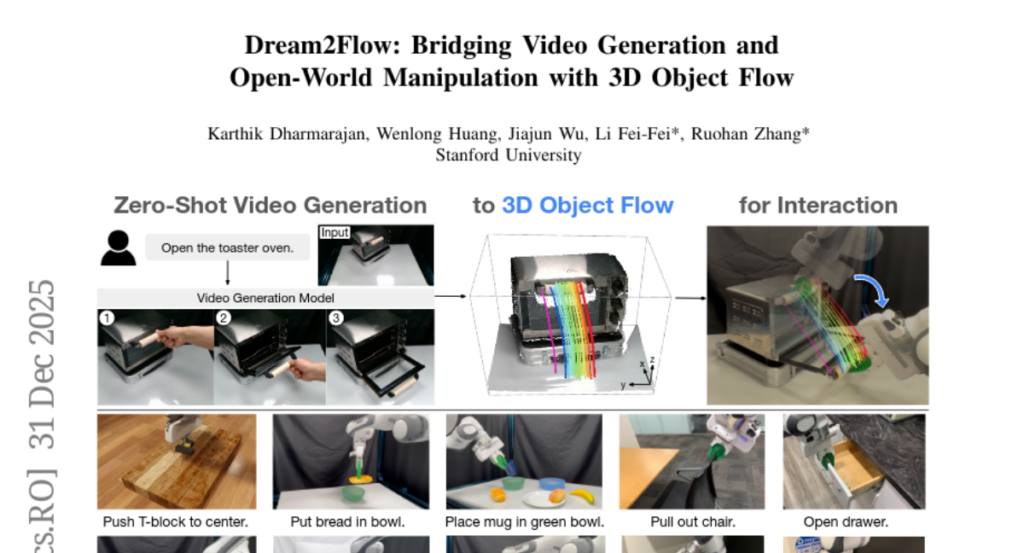 – The authors introduce Dream2Flow, which reconstructs 3D object motions from generated videos and formulates manipulation as object trajectory tracking using trajectory optimization or reinforcement learning.