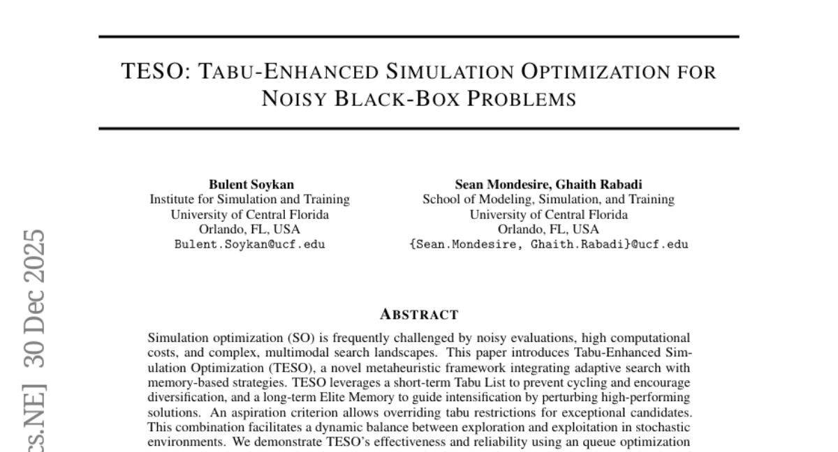 – Introduce a novel metaheuristic framework, TESO, to address challenges in simulation optimization such as noisy evaluations and complex search landscapes.