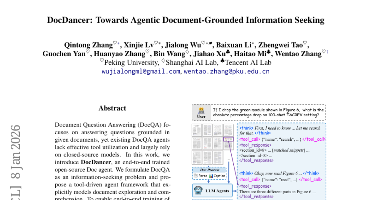 – Introduce DocDancer, an open-source document question answering agent that addresses limitations in current models by using a tool-driven framework and information-seeking problem formulation.