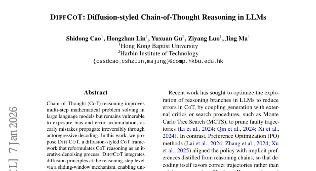 – The paper aims to enhance Chain-of-Thought reasoning by introducing DiffCoT, which reformulates reasoning as an iterative denoising process using diffusion principles.