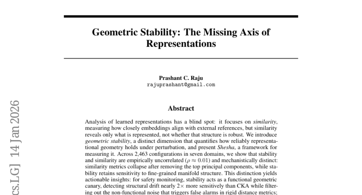 – Introduce and quantify geometric stability as a dimension of representational robustness under perturbation, providing a necessary complement to similarity metrics for auditing learned representations.