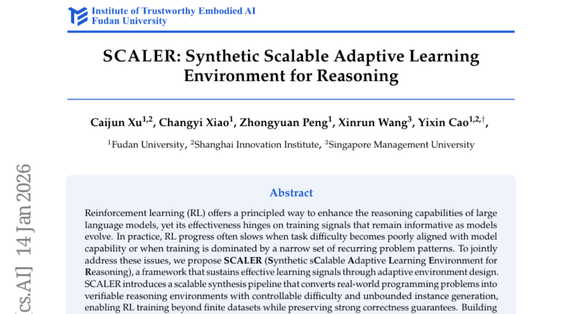 – To enhance the reasoning capabilities of large language models using SCALER, a framework that maintains effective training signals through adaptive environment design and multi-environment strategies.