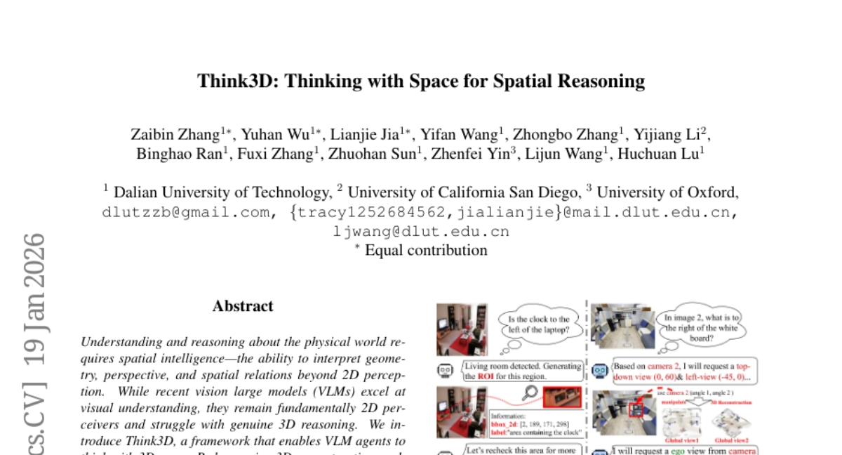 – Introduce Think3D framework to enhance Vision-Language Models’ 3D reasoning capabilities by enabling interactive spatial exploration.
