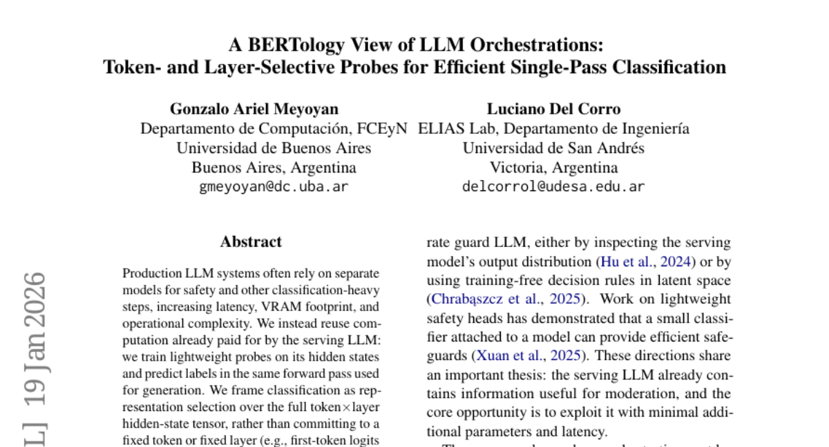 7. A BERTology View of LLM Orchestrations: Token- and Layer-Selective Probes for Efficient Single-Pass Classification