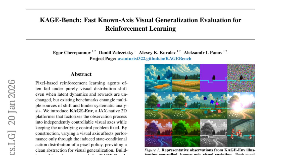 – Development of KAGE-Bench, a benchmark comprising six known-axis suites and 34 train-evaluation pairs to isolate individual visual shifts.