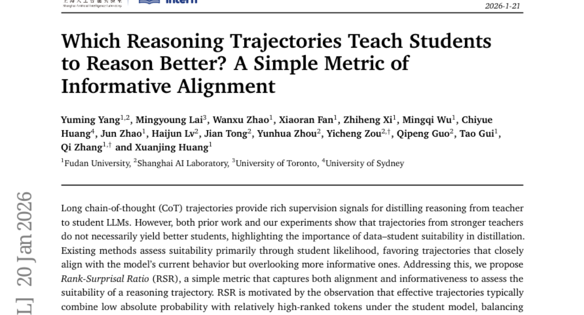 – Introduce a novel metric, Rank-Surprisal Ratio (RSR), to improve the assessment of reasoning trajectories for knowledge distillation in large language models.