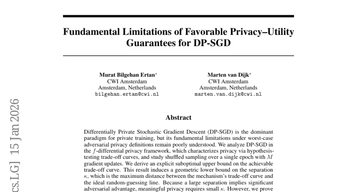 – The research identifies a critical bottleneck in achieving strong privacy without degrading utility in DP-SGD, as the required Gaussian noise levels for shuffled sampling result in significant accuracy degradation, thereby underscoring a fundamental trade-off under adversarial assumptions.