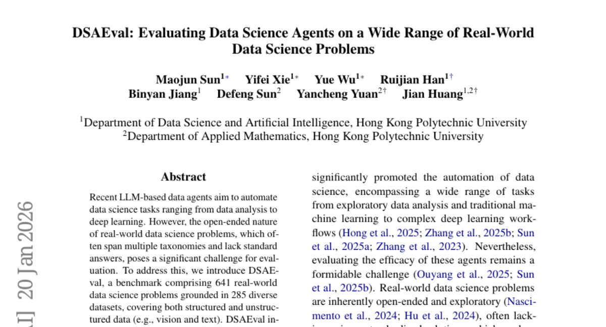 – Introduction of DSAEval, a benchmark featuring 641 real-world data science problems based on 285 datasets, with three key features for evaluation: Multimodal Environment Perception, Multi-Query Interactions, and Multi-Dimensional Evaluation.