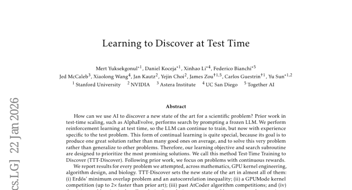 – TTT-Discover sets a new state of the art in various fields including mathematics, GPU kernel engineering, algorithm design, and biology, with solutions reviewed by experts, achieved using an open model and reproducible with publicly available code.