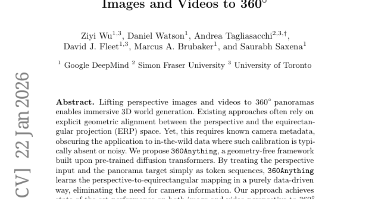 – The framework, named 360Anything, achieves state-of-the-art performance in generating 360ยฐ panoramas from images and videos. It surpasses existing methods that rely on ground-truth camera information and demonstrates enhanced geometric understanding in zero-shot camera FoV and orientation estimation benchmarks.