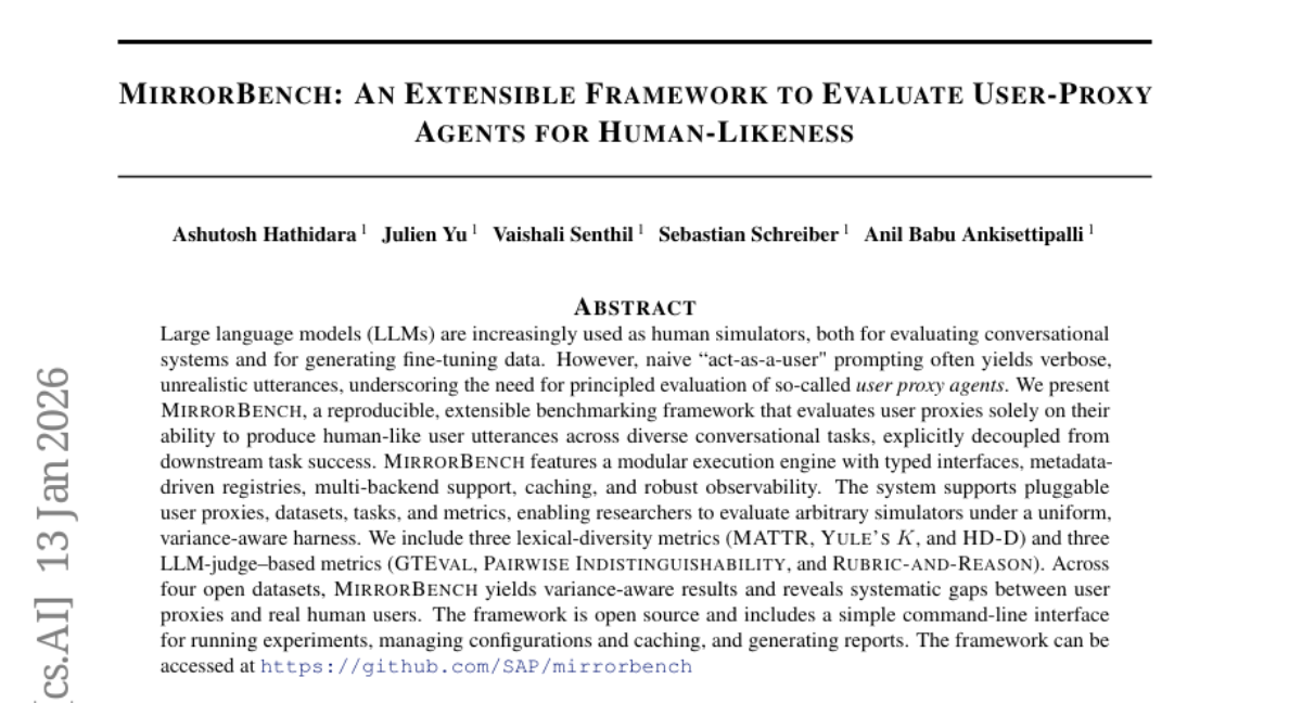 – The researchers present MIRRORBENCH, a modular and extensible benchmarking framework incorporating typed interfaces, metadata-driven registries, and multi-backend support. The system evaluates user proxies with both lexical-diversity metrics and LLM-judge-based metrics across four open datasets.