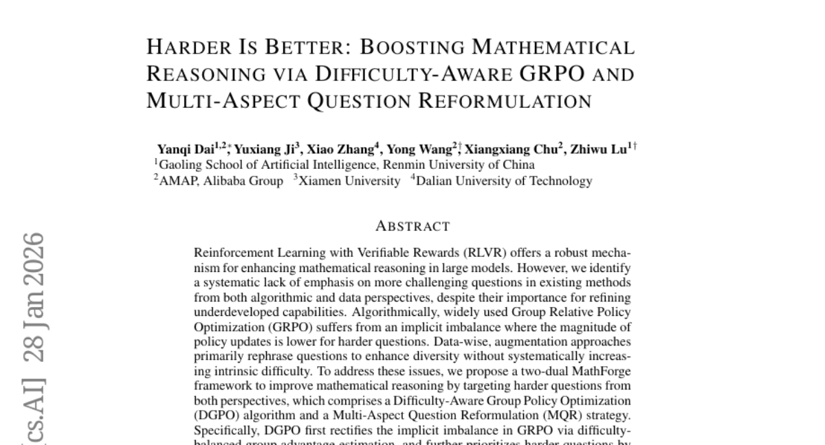 1. Harder Is Better: Boosting Mathematical Reasoning via Difficulty-Aware GRPO and Multi-Aspect Question Reformulation