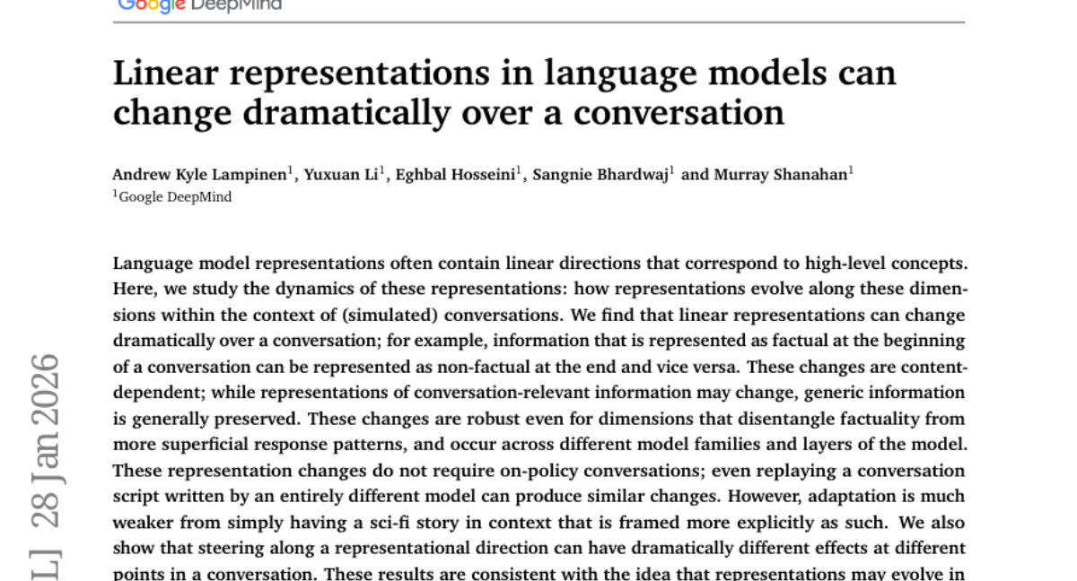 – Explore how linear representation directions in language models change dynamically during conversations, affecting how information, particularly factual content, is encoded.