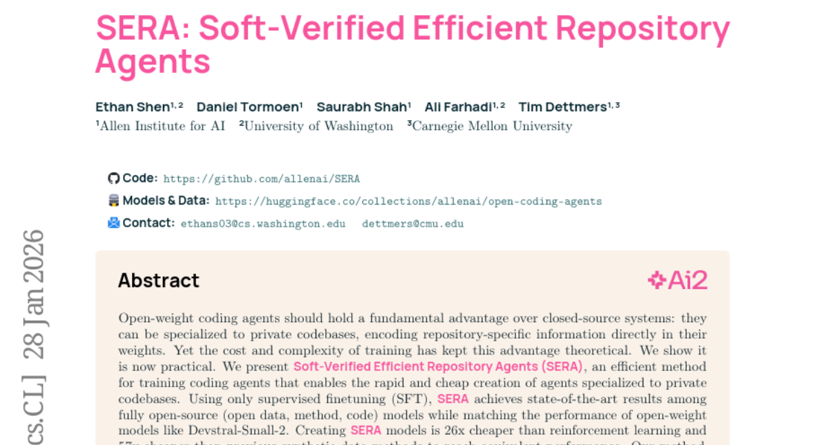 – The authors developed SERA using Soft Verified Generation (SVG), a method that generates thousands of trajectories from a single code repository, making it significantly cheaper and efficient compared to reinforcement learning and previous synthetic data methods.