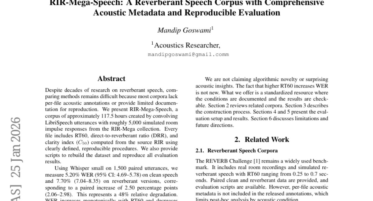 – The study presents RIR-Mega-Speech, a corpus created by convolving LibriSpeech utterances with roughly 5,000 simulated room impulse responses. Each file has acoustic conditions like RT60, direct-to-reverberant ratio (DRR), and clarity index well-documented and reproducible.