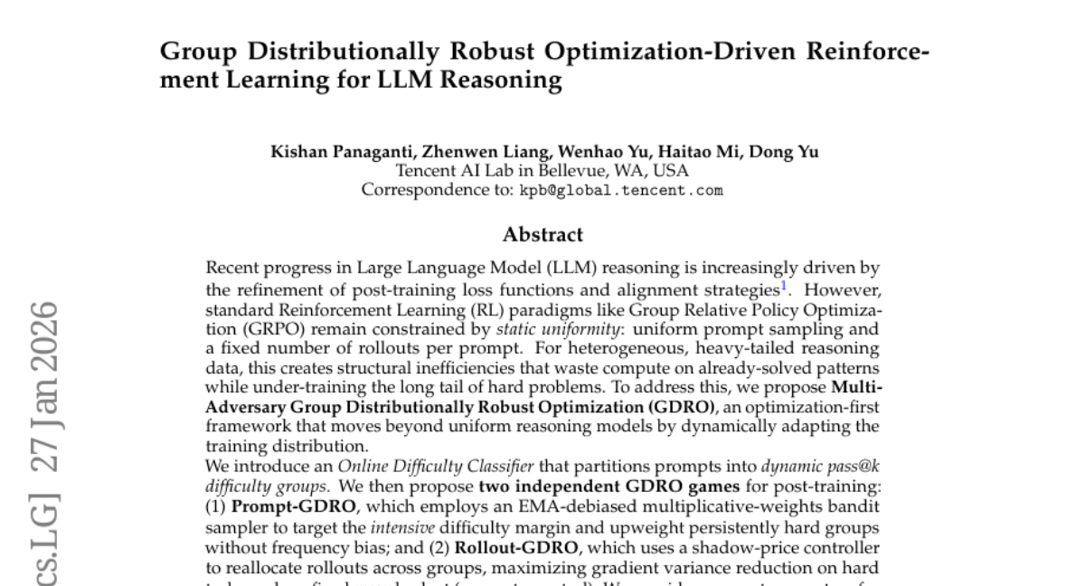 ๐ Keywords: Large Language Model, GDRO, Reinforcement Learning, Online Difficulty Classifier, EMA-debiased multiplicative-weights bandit sampler