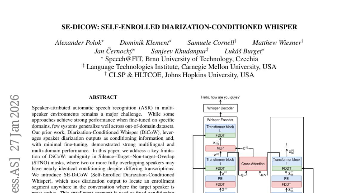๐ Keywords: SE-DiCoW, Speaker-attributed ASR, Diarization, Cross-attention, tcpWER