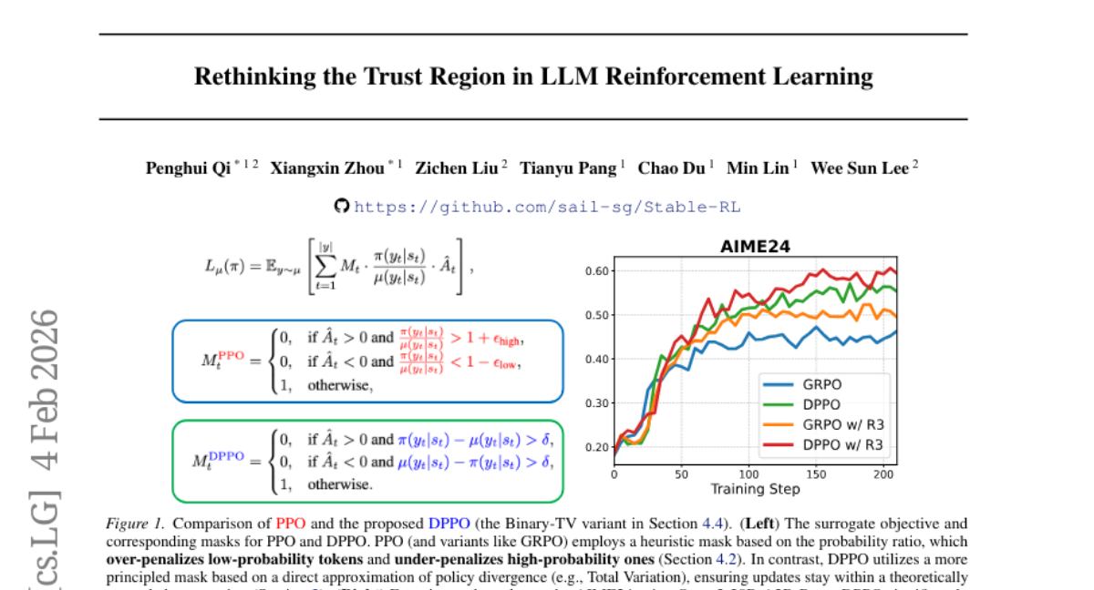 – Introduced Divergence Proximal Policy Optimization (DPPO) with a principled policy divergence constraint. Used Binary and Top-K approximations to manage memory usage and computational overhead.