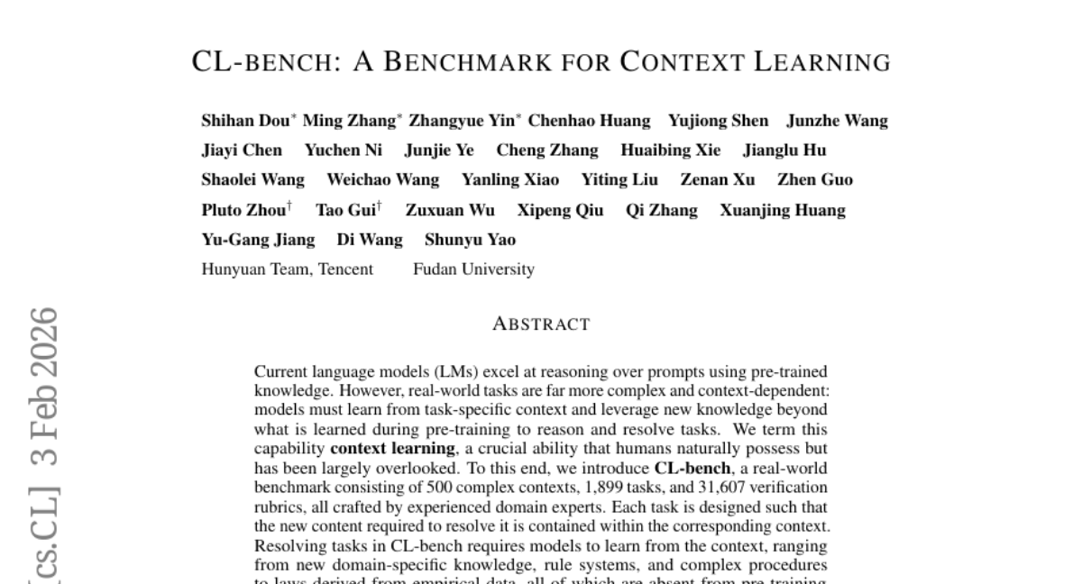 – Introduced CL-bench, a comprehensive benchmark with 500 complex contexts, 1,899 tasks, and 31,607 verification rubrics, crafted to evaluate the context learning ability of language models.