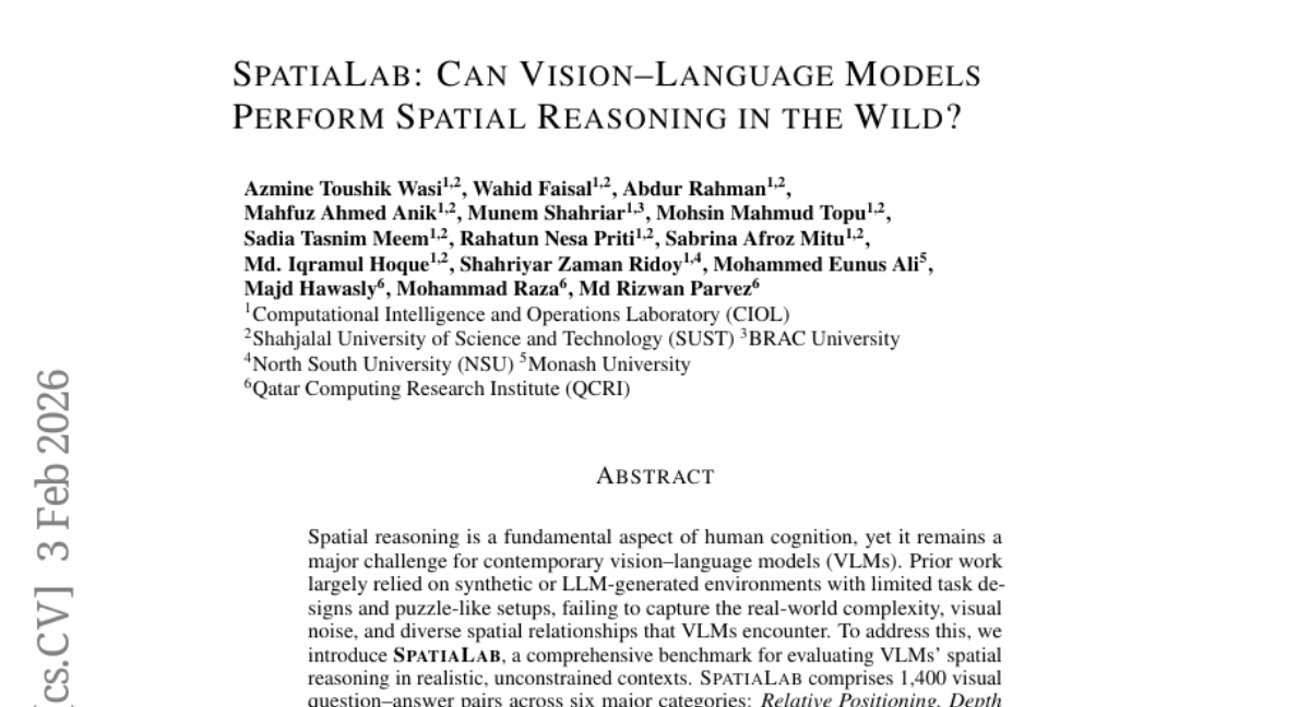 – The study aims to evaluate and advance the spatial reasoning capabilities of vision-language models (VLMs) through the introduction of a comprehensive benchmark called SpatiaLab.
