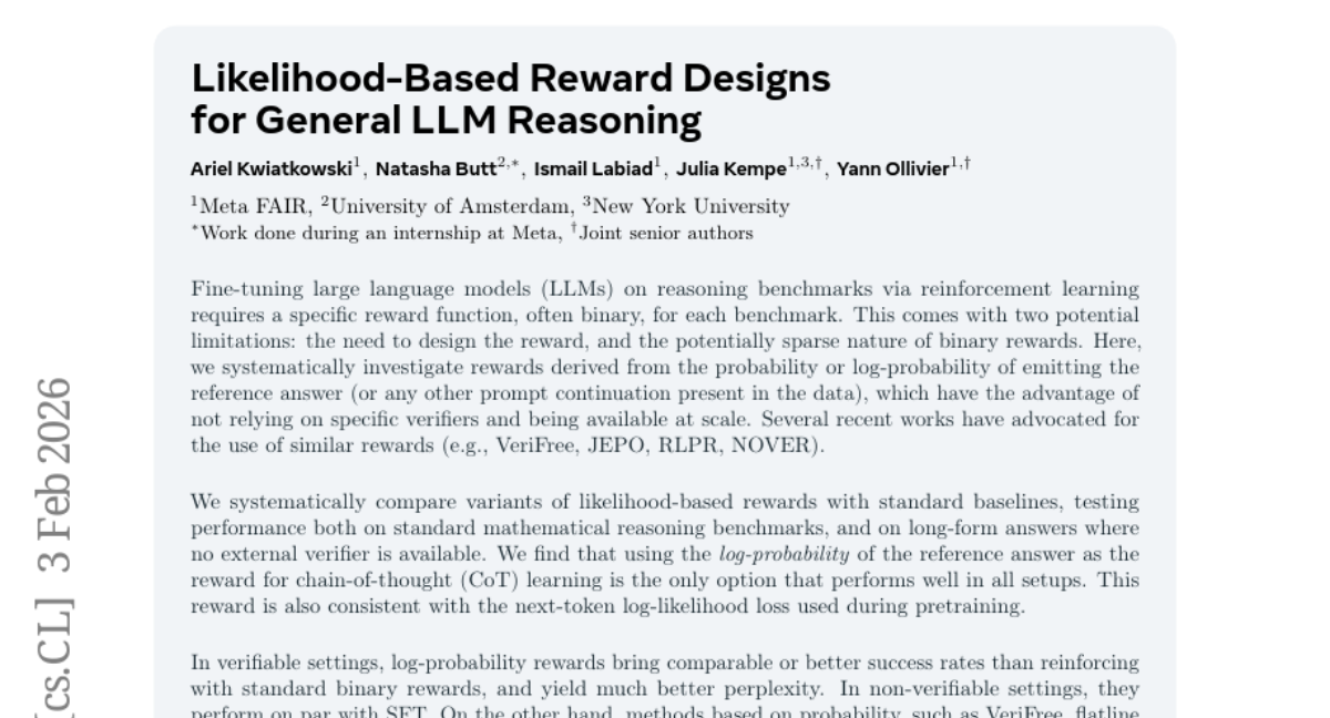 – Systematic investigation and comparison of log-probability derived rewards with standard baselines on both verifiable and non-verifiable reasoning benchmarks, employing reinforcement learning methodologies.