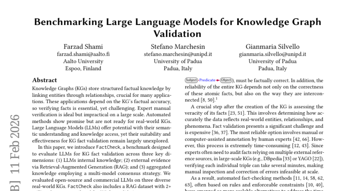 – Evaluation of open-source and commercial LLMs on three real-world KGs using FactCheck, assessing dimensions such as LLMs’ internal knowledge, external evidence via Retrieval-Augmented Generation, and aggregated knowledge through multi-model consensus.