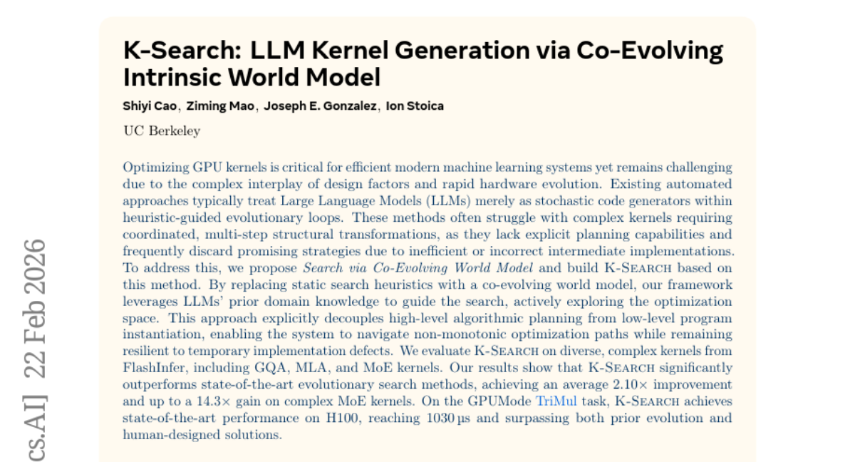 – The research aims to optimize GPU kernels by separating high-level planning from low-level implementation, using a co-evolving world model to enhance performance significantly over existing evolutionary methods.