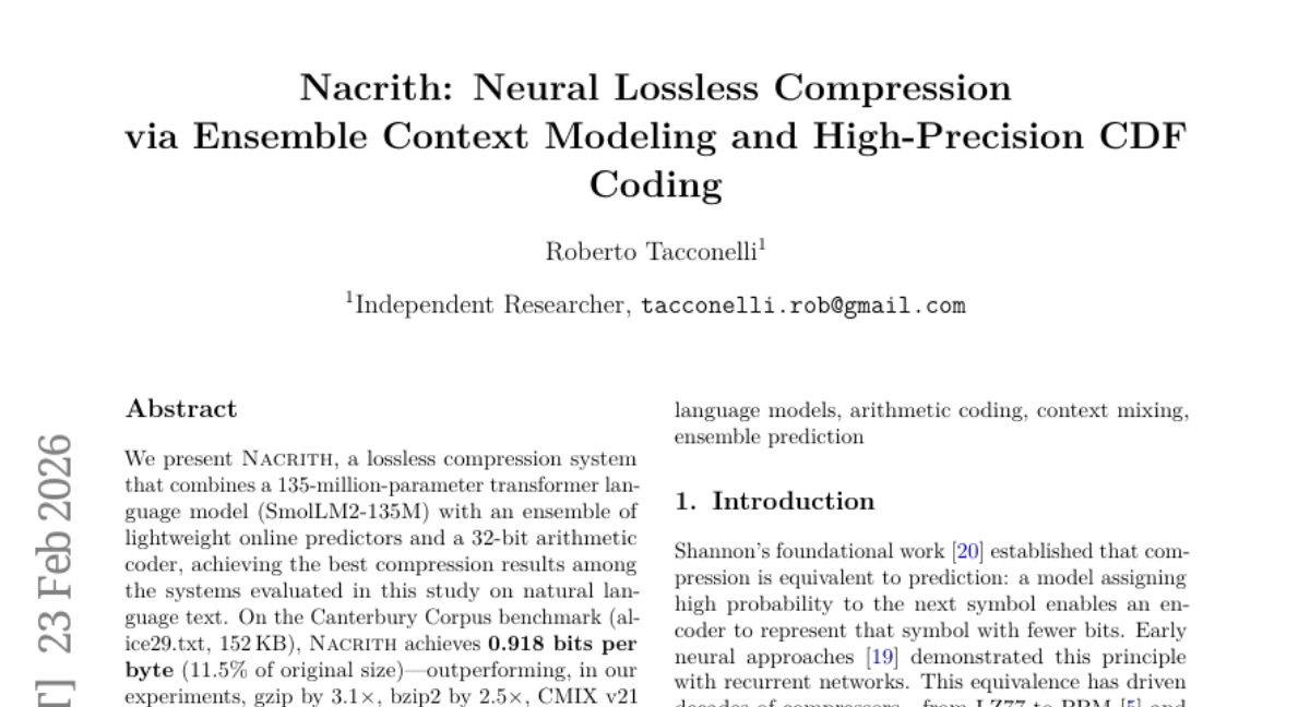 – Nacrith utilizes a 135M-parameter transformer language model combined with lightweight online predictors and a 32-bit arithmetic coder.