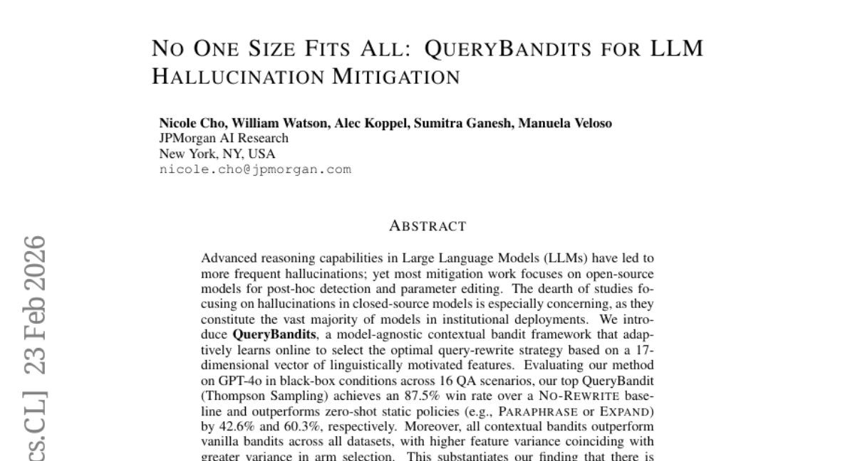 – Introduce a contextual bandit framework called QueryBandits to reduce hallucinations in large language models and optimize query-rewrite strategies in closed-source models.
