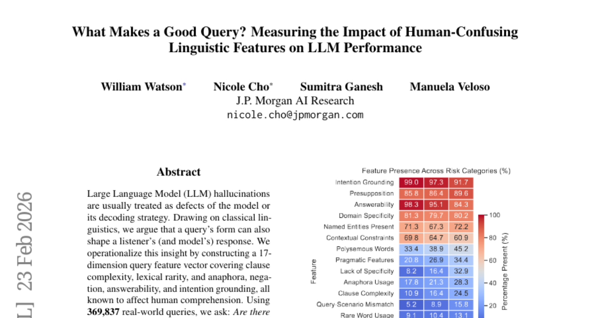 – The analysis reveals that deep clause nesting and underspecification increase hallucination risk, while clear intention grounding and answerability decrease it. It establishes an empirically observable representation of query features associated with hallucination risk, suggesting possibilities for guided query rewriting and future interventions.