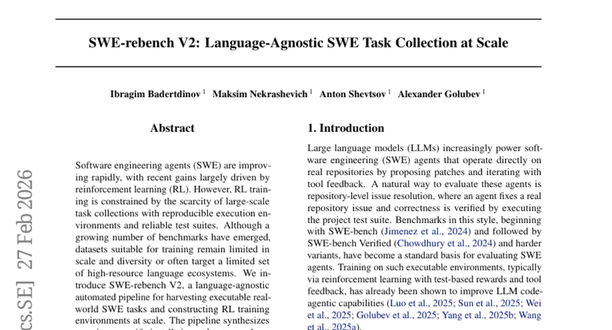 – The research introduces and releases the SWE-rebench V2 dataset, enhancing the training potential of software engineering agents with its diverse and reproducible task collection, aiming for large-scale reinforcement learning applications.