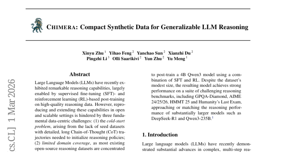 – The study aims to overcome data-centric challenges in training Large Language Models (LLMs) for cross-domain reasoning by introducing a synthetic reasoning dataset called CHIMERA, which provides performance comparable to much larger models.