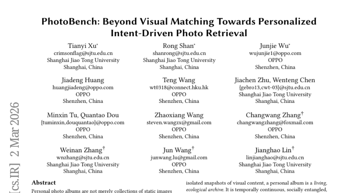 – Introduce PhotoBench, the first benchmark for personal photo retrieval focusing on personalized multi-source intent-driven reasoning instead of visual matching.