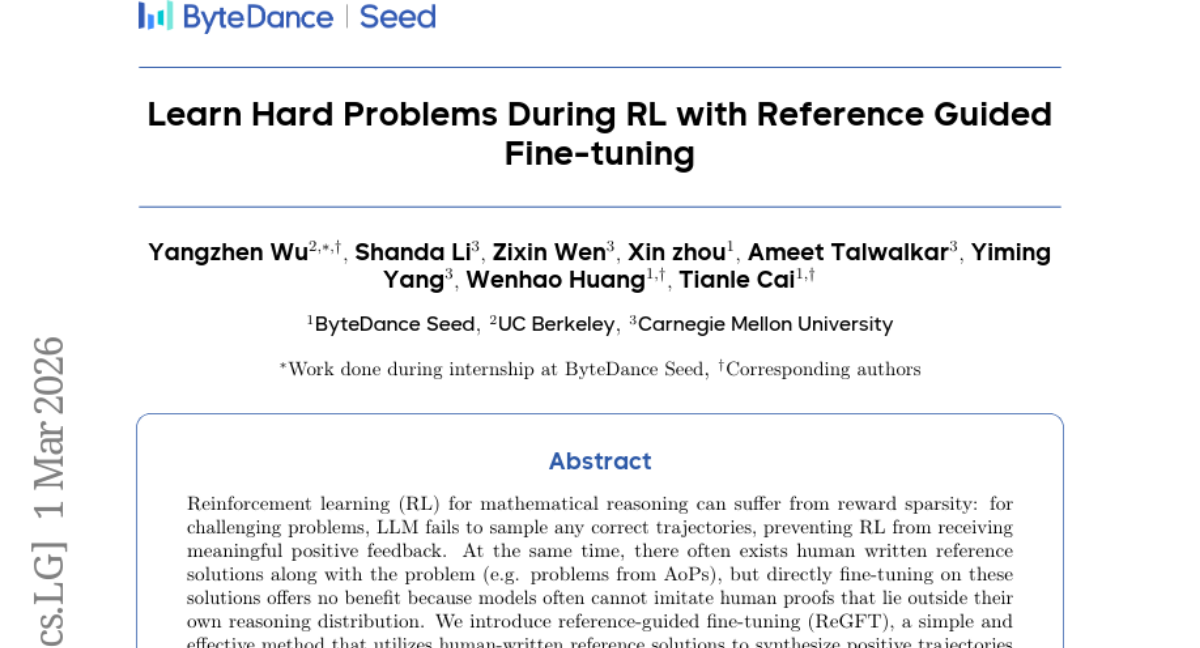 – Address reward sparsity in reinforcement learning for mathematical reasoning using Reference-Guided Fine-Tuning.