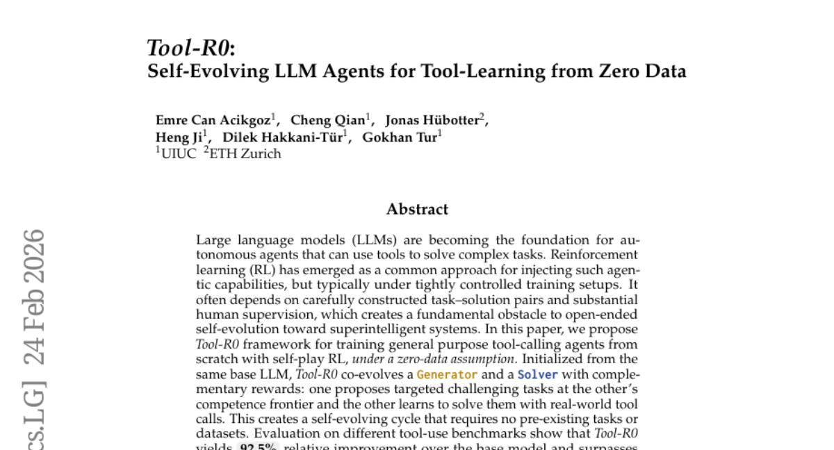 – Tool-R0 demonstrated a 92.5% improvement over the base model and outperformed fully supervised tool-calling baselines, offering insights into self-play LLM agents’ co-evolution, curriculum dynamics, and scaling behavior.