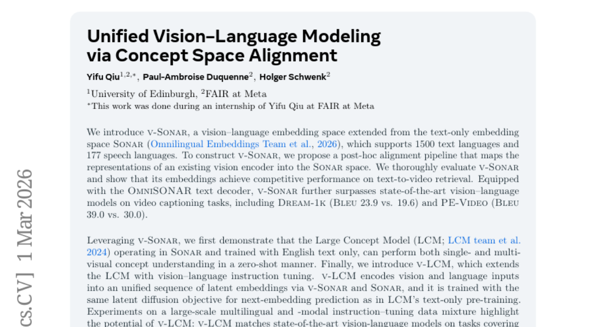 – The primary objective is to extend the text-only SONAR embedding space to support vision-language tasks, enabling zero-shot visual concept understanding.
