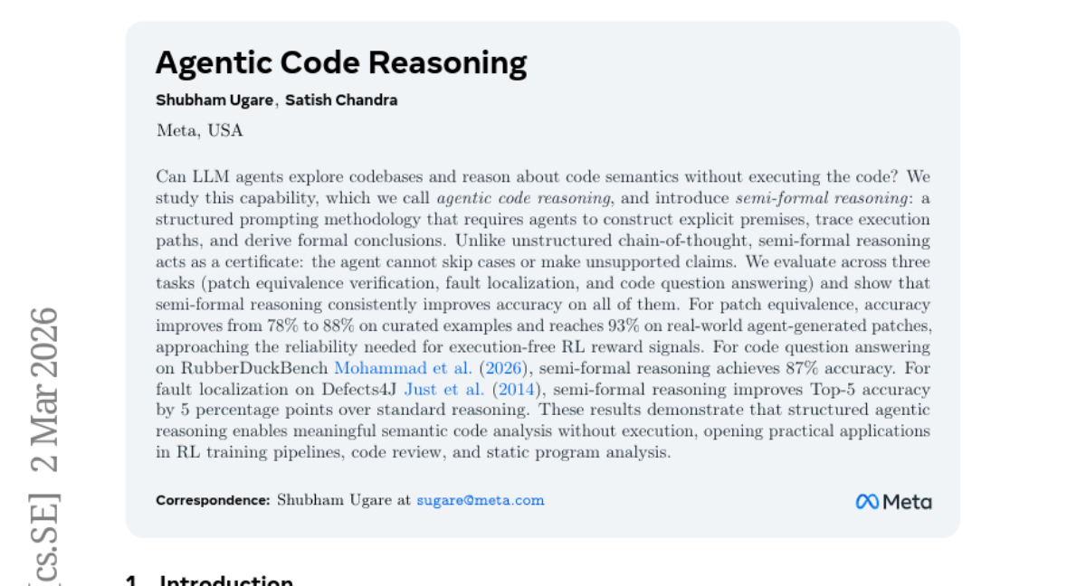 – The results highlight that structured agentic reasoning enables semantic code analysis without execution, facilitating applications in RL training, code review, and static program analysis.