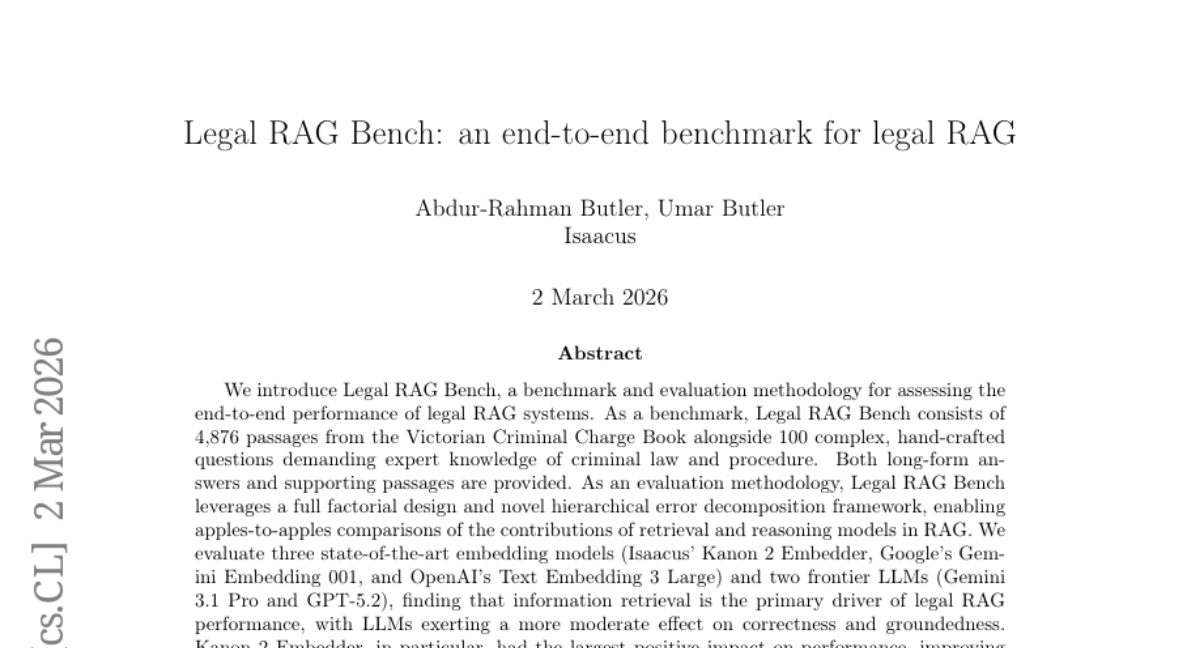 – Introduce and assess the Legal RAG Bench, a benchmark and evaluation methodology for legal retrieval-augmented generation systems.