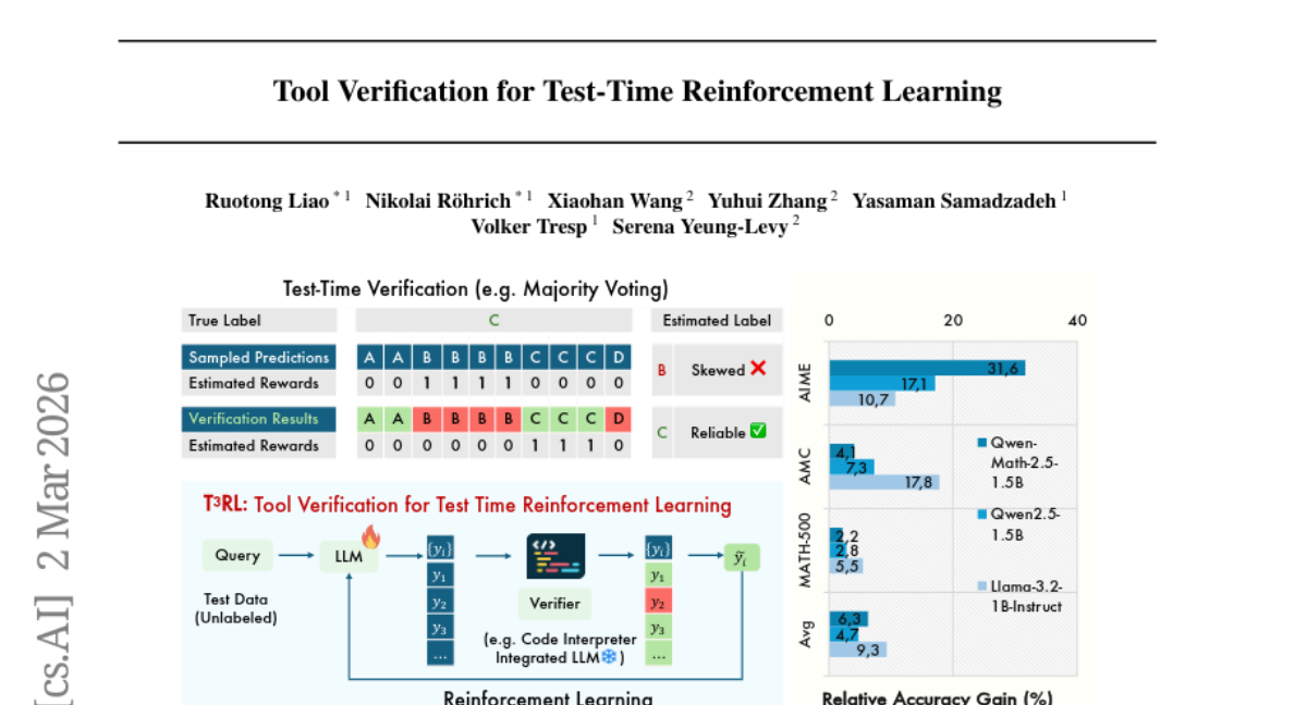– Utilizes Tool-Verification for Test-Time Reinforcement Learning (T^3RL) by employing an external tool for evidence, facilitating verification-aware voting to improve the reliability of pseudo-labels used for training.