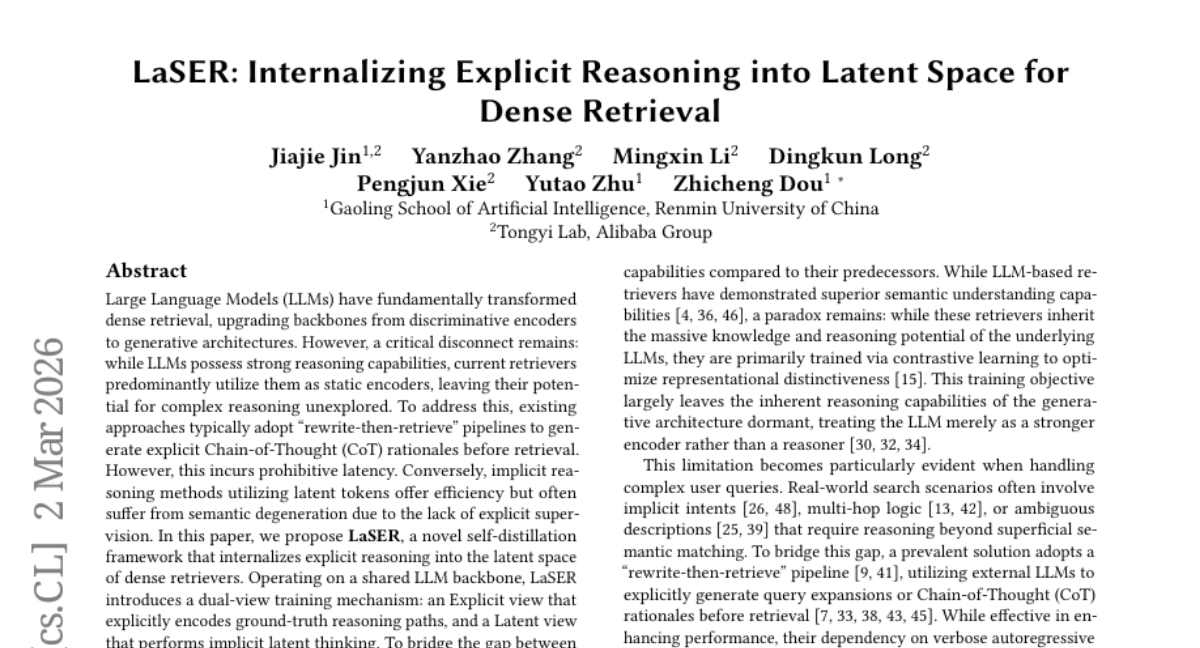 – The study proposes LaSER, a self-distillation framework that enhances reasoning capabilities within dense retrievers’ latent space to enable efficient reasoning without relying on autoregressive generation.