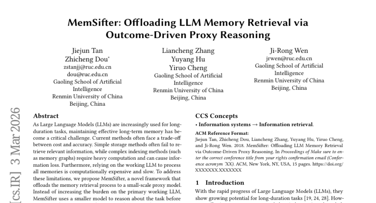 – To develop MemSifter, a framework aimed at improving long-term memory efficiency and accuracy in Large Language Models by offloading memory retrieval to a small proxy model.