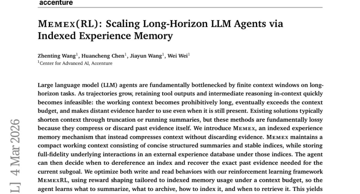 – This study introduces a memory mechanism called Memex, aimed at enabling large language model agents to better handle long-horizon tasks by maintaining a compact context without discarding essential evidence.