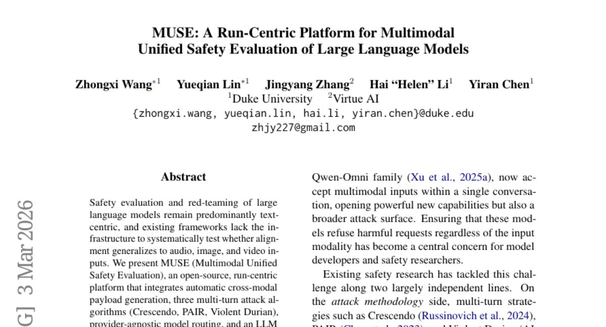– MUSE integrates automated cross-modal attack generation, employs three multi-turn attack algorithms, and uses an LLM judge with a five-level safety taxonomy to test multimodal input alignment.