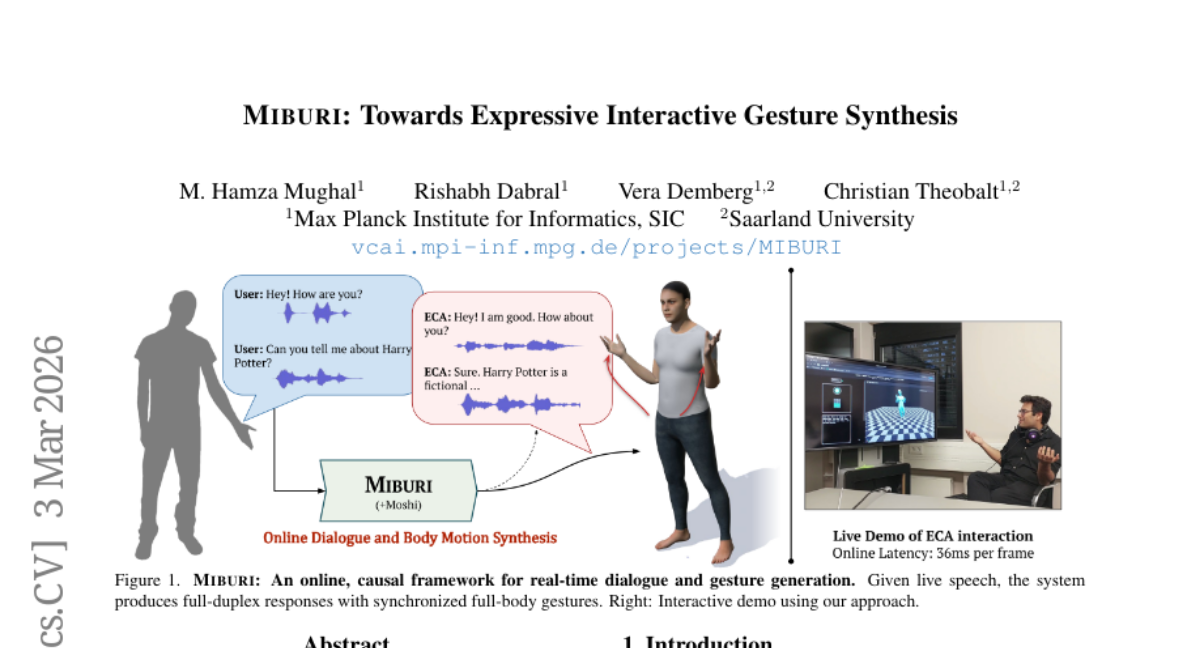 – The research aims to develop MIBURI, a framework that generates expressive full-body gestures and facial expressions synchronized with real-time spoken dialogue, addressing the current limitations in Embodied Conversational Agents (ECAs).